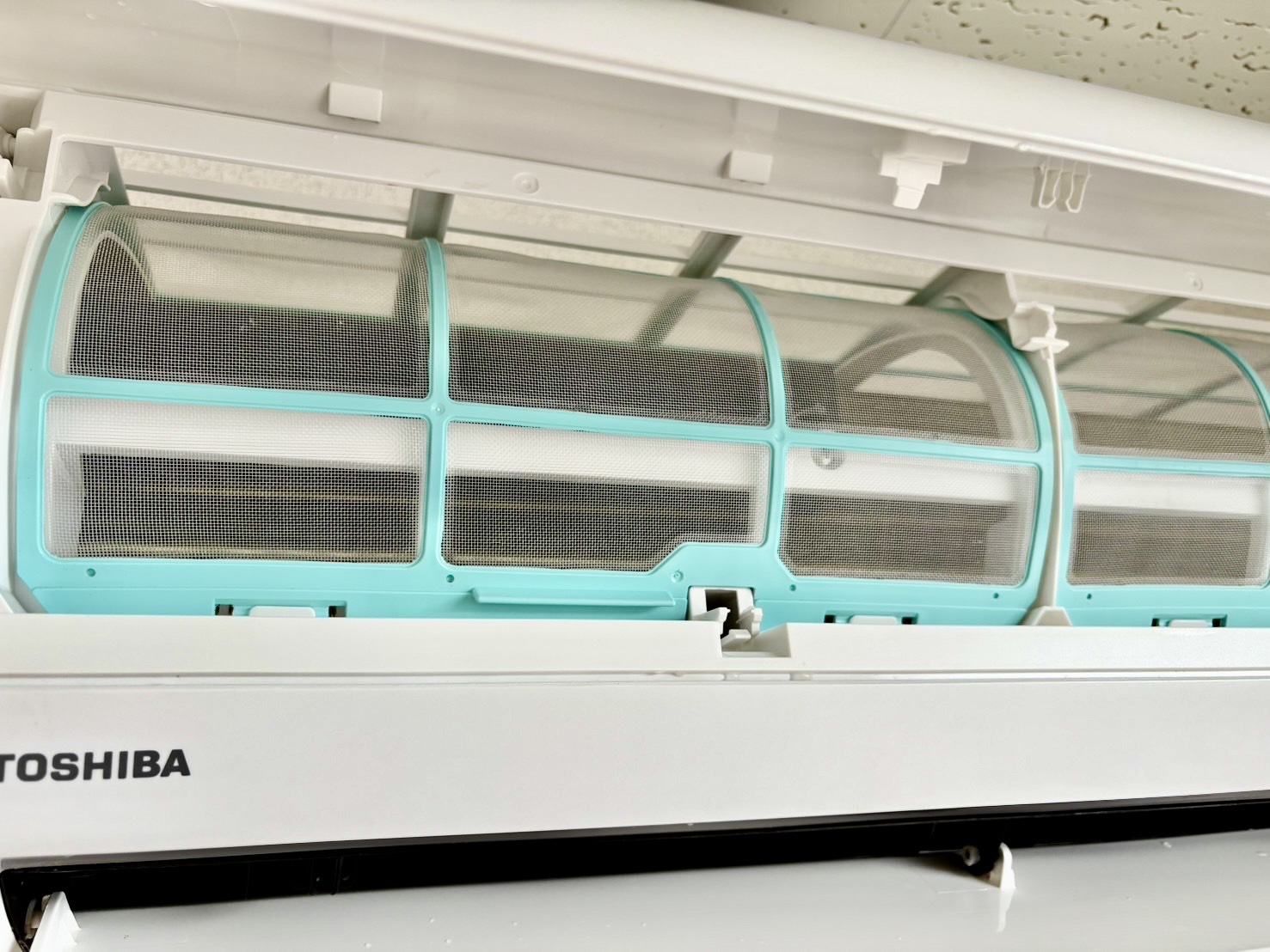 エアコンの外観ですが、一見すると非常に綺麗に見えますが、分解して内部を確認すると、やはり毎日長時間稼働していることもあって、フィルター奥にはホコリが蓄積し、ファンやアルミフィンにはカビ汚れがしっかりと広がっていました。