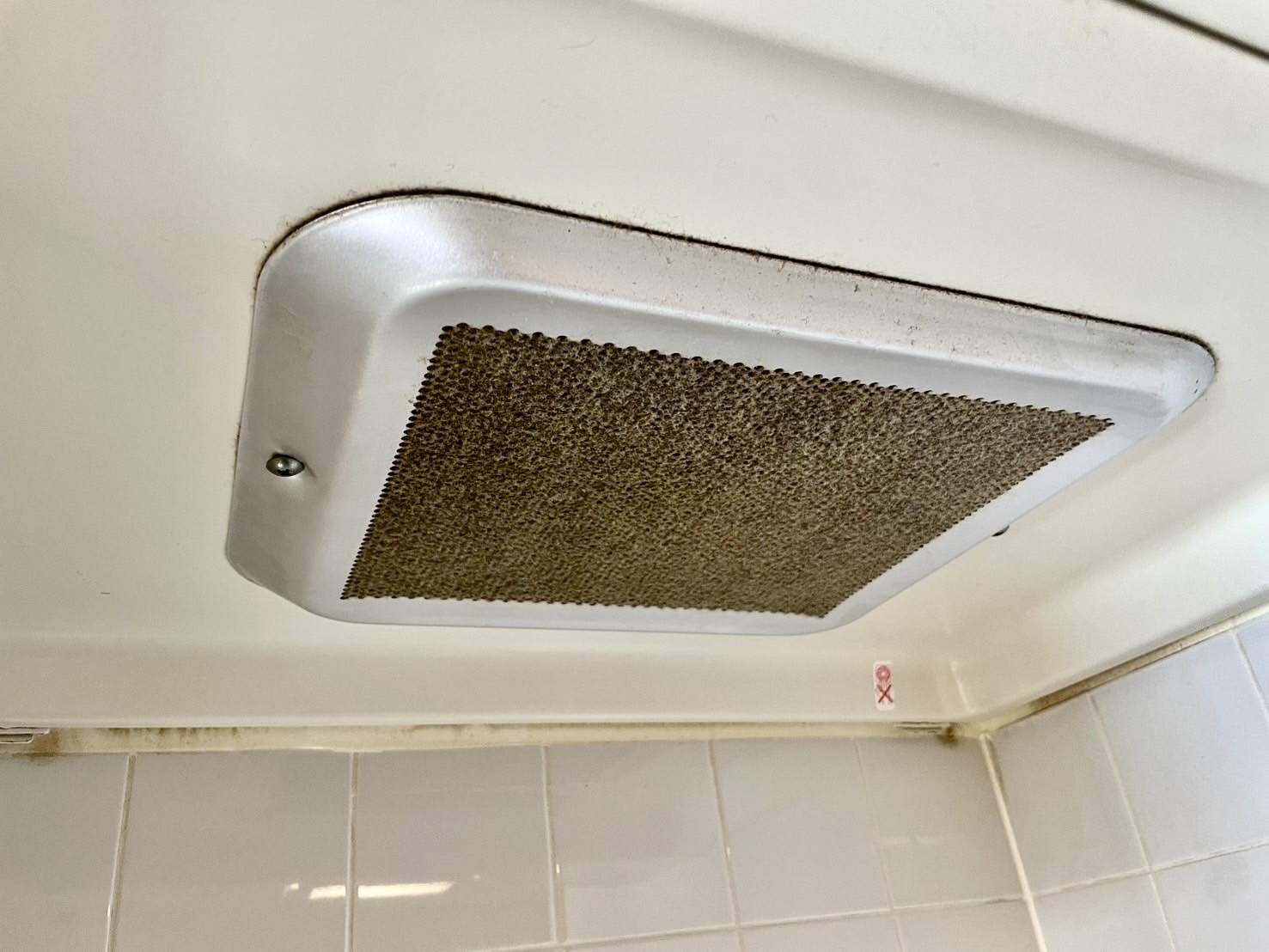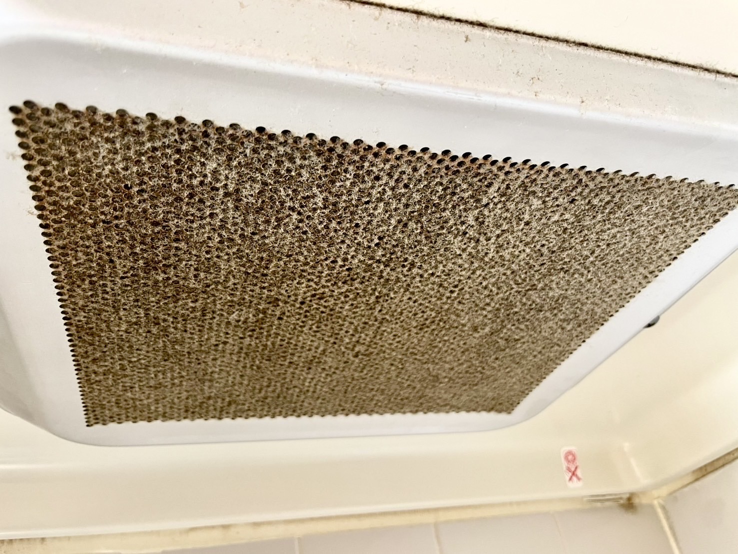お写真にもある通り、換気扇フィルターには長年の使用による油汚れがびっしりと付着し、目詰まりを起こしていました。